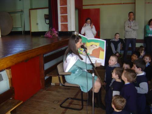 Aoibhinn ag léamh scéal as Gaeilge do na daltaí óga.