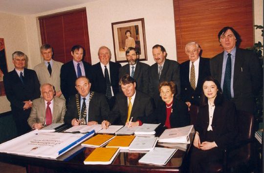 | Signing of Contract for Knock Sewerage and Sewage Disposal Scheme, Contract No. 1, Civil Engineering Works. Contractors are Coffey Construction Ltd., Athenry, Co. Galway, and the value of the contract is €9.3M euros. Front Row L-R: Paddy Coffey, Coffey Construction Ltd., Cllr. Jimmy Maloney, Cathaoirleach, Mayo County Council, Des Mahon, Mayo County Manager, Olive Coffey, Coffey Construction Ltd. and Kathleen Hussey, Mayo County Council. Back L-R: Pat Commons, Mayo County Council, Paul Miskella, P.J. Tobin & Co. Ltd. Consulting Engineers, Cllr. John Cribbin, Cllr. Pat McHugh, Joe Beirne, Director of Services/County Engineer, Cllr. John Carty, Donal Downes, P.J. Tobin & Co. Ltd. Consulting Engineers, Brian Reilly, Mayo County Council, | |||